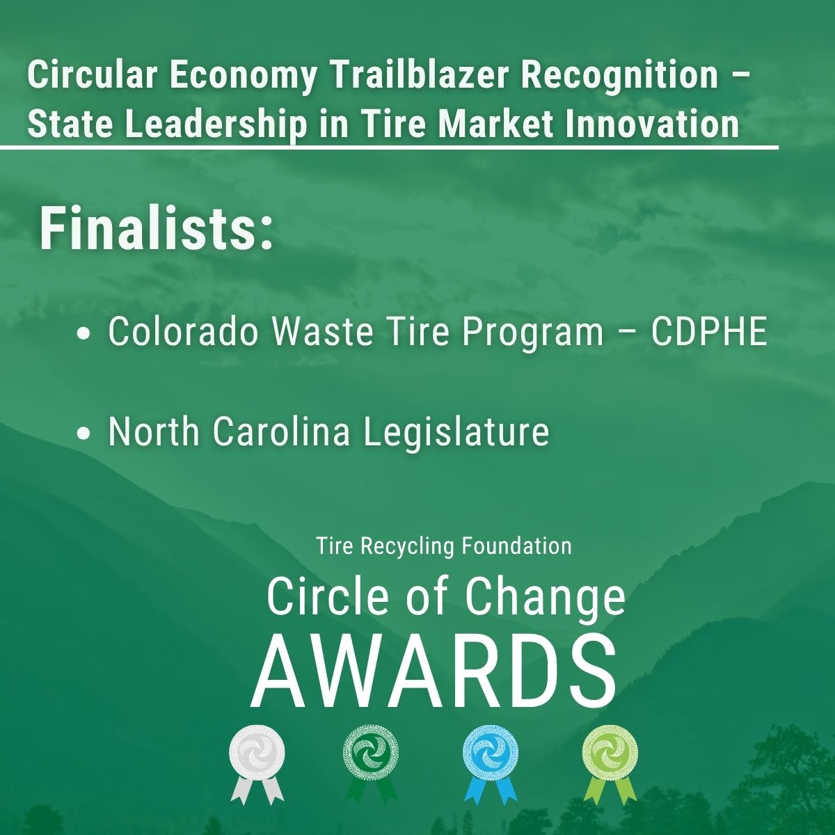 The Tire Recycling Foundation Circle of Change Awards program is a national recognition program honoring organizations, teams, and individuals who are advancing tire recycling technologies, expanding end-use markets, and demonstrating leadership in sustainability and circular economy principles.